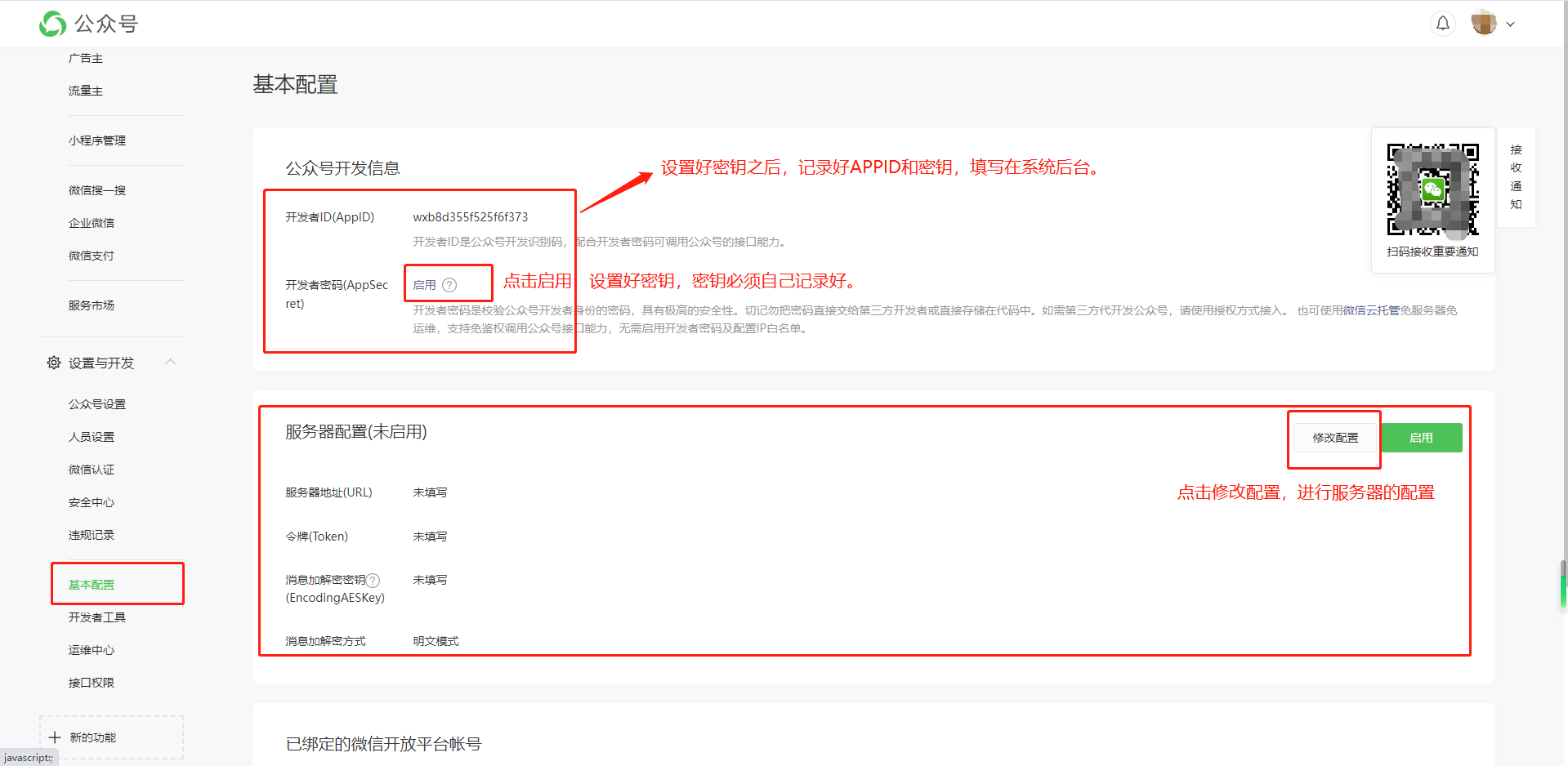 2:点击基本配置,填写开发信息和服务器配置,先设置好密钥、白名单再进行服务器配置。