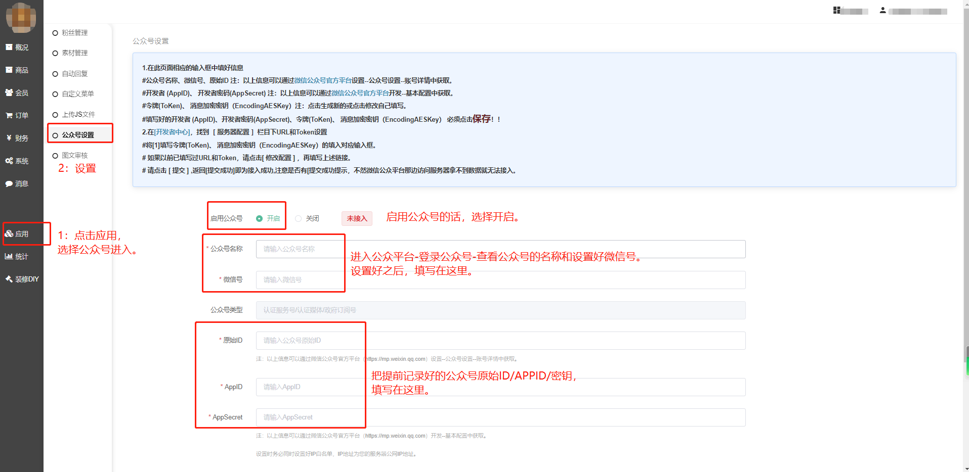 7:在商城系统后台-应用-公众号-设置,填写好在公众号后台记录好的信息