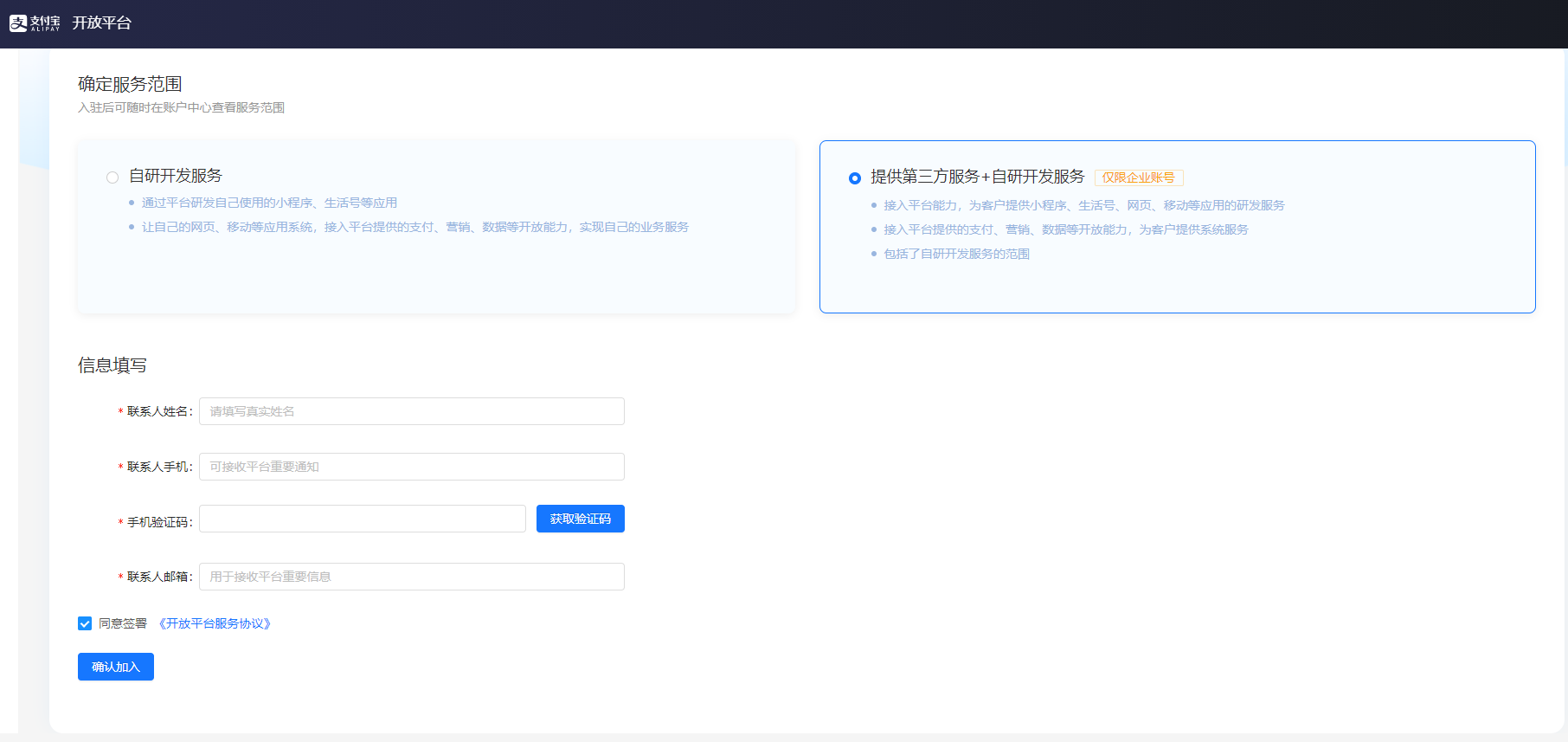 二、进入我的开放平台,入驻开发者,若是首次入驻,可选择入驻‘提供第三方服务+自研开发服务’,入驻成功后,在网页&移动应用创建应用。