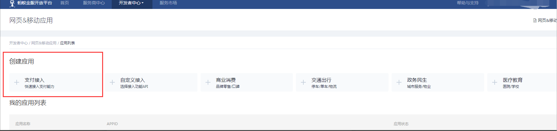 三、点击支付接入,创建新应用,功能勾选‘手机网站支付’,注意:手机网站支付必须是已开通下来。