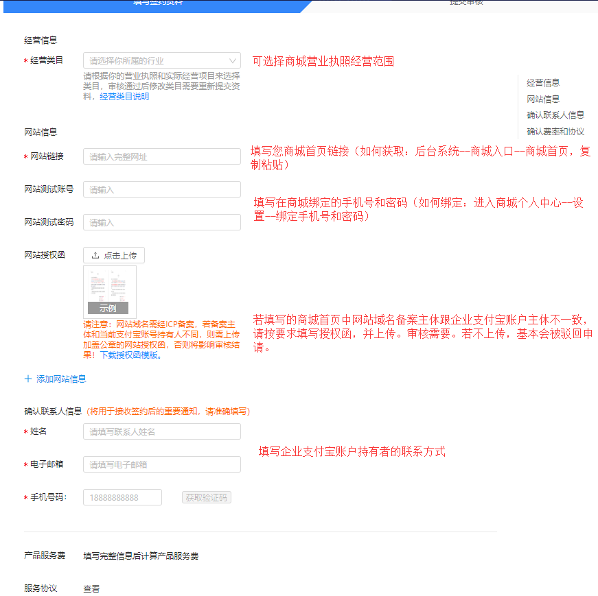 (二)支付宝接入手机网站支付链接:https://b.alipay.com/signing/productDetailV2.htm?productId=I1011000290000001001,点‘立即接入’,签约需要准备的资料:企业经营信息、网址信息(商城首页链接和绑定商城的手机号码和密码)、商户联系人信息,提交申请。服务开通约1个工作日