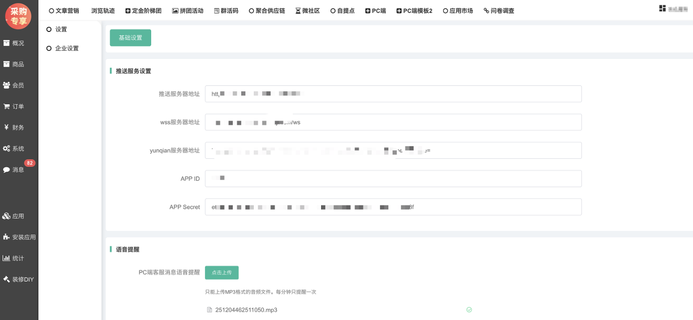 推送服务设置:设置后,客户在线发起客服咨询,客服端才能收到咨询消息;